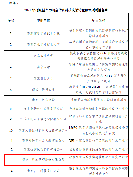 近日,我司科研項(xiàng)目《清水型生態(tài)系統(tǒng)構(gòu)建技術(shù)應(yīng)用研發(fā)及產(chǎn)業(yè)化》成功申報(bào)2021年棲霞區(qū)科技成果轉(zhuǎn)化項(xiàng)目。這是公司在科研方面的持續(xù)投入及創(chuàng)新能力的不斷提升,也是對公司研發(fā)實(shí)力的肯定。